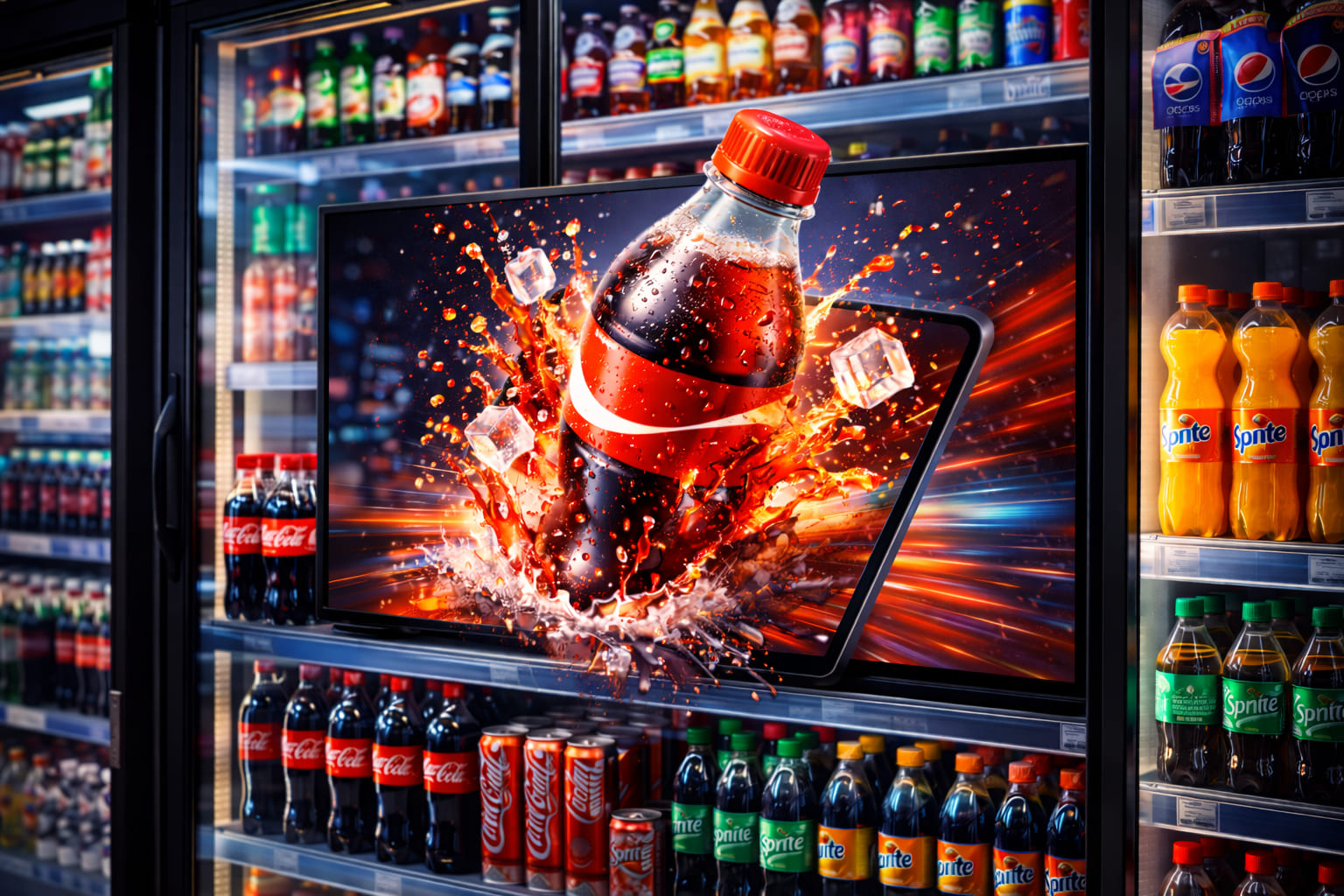 Для производителей напитков Как передать свежесть и вкус через стекло витрины? Покажите бутылку вашего напитка в 3D: капли конденсата, стекающие по холодному стеклу, всплеск жидкости, вырывающийся за пределы плоскости экрана, летящие на зрителя кубики льда. Это вызывает жажду и желание купить продукт на физиологическом уровне.